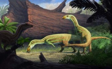 Artist’s reconstruction of Sonselasuchus cedrus in its environment, 215 million years agoGabriel Ugueto An early relative of crocodiles spent its...