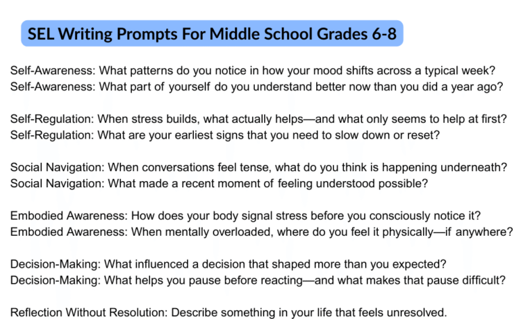 • 50 SEL writing prompts for grades 6–8