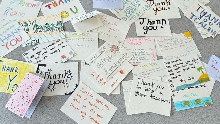 A pile of handwritten thank you notes for US teacher appreciation week