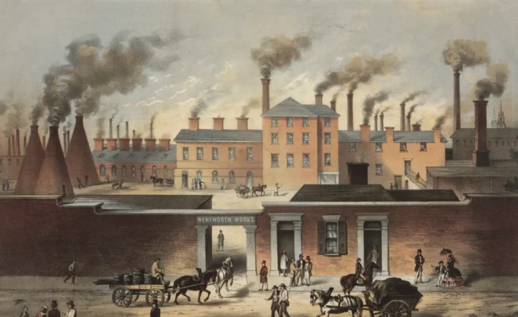 Illustrations, from above: The well-guarded Wentworth Works steel factory in Sheffield, England, 1860; Portrait of Marc Isambard Brunel by James Northcote, 1813; A trade card of instrument maker J.M. Hyde, Bristol, 1841-55; An 1809 edition of Hamilton’s ‘Report on Manufactures,’ 1791; James Sullivan Lincoln’s Portrait of Samuel Slater, date unknown (Brown University, Providence); Jedediah Strutt’s textile mill at Belper, Derbyshire diagram showing the construction, waterwheel and line shafts; and the Slater Mill in Pawtucket, Rhode Island, around 1897.
