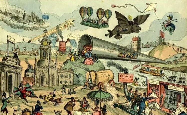 Illustrations from above: “March of Intellect” print by William Heath,” ca. 1828 (British Museum); Undated portrait of Bern Dibner (NYU Libraries); Logo of the Polytechnic Institute of Brooklyn; Dibner’s Heralds of Science, 1955; and Francesco Villamena’s portrait of Galileo Galilei, 1613.