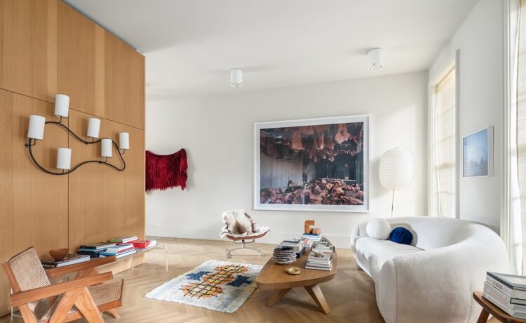 With 4,400 square feet of interior living space, the 22-foot-wide townhouse offers five bedrooms and four-and-a-half baths. Up a wide stoop, enter on the parlor floor. The main living space is anchored by a sculpted, curving staircase and framed by pale oak chevron-patterned floors. A large, sunny living room opens at the front of the home.