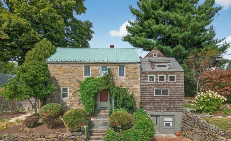 Upstairs, an airy primary suite sits beneath soaring ceilings. Three more bedrooms and a bathroom retain original stonework and wood accents. On the home’s lowest level is a convenient home gym.
