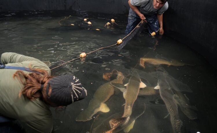 Farmers carry a paiche from one of the ponds where it’s sustainably raised.