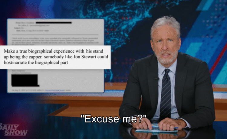 Stewart also joked about having been mentioned in the Epstein files himself, though he wasn’t involved in any of the nefarious activities chronicled. Rather, Stewart is mentioned in a 2015 email exchange between Epstein and producer Barry Josephson, in which the former put forward the idea of a stand-up comedy special starring “Woody.” (“You all know which Woody, right? It’s the Epstein files, it ain’t Harrelson.”) In response, Josephson suggested that instead “make a true biographical experience with his stand-up being the capper. Somebody like Jon Stewart could host/narrate the biographical part.”