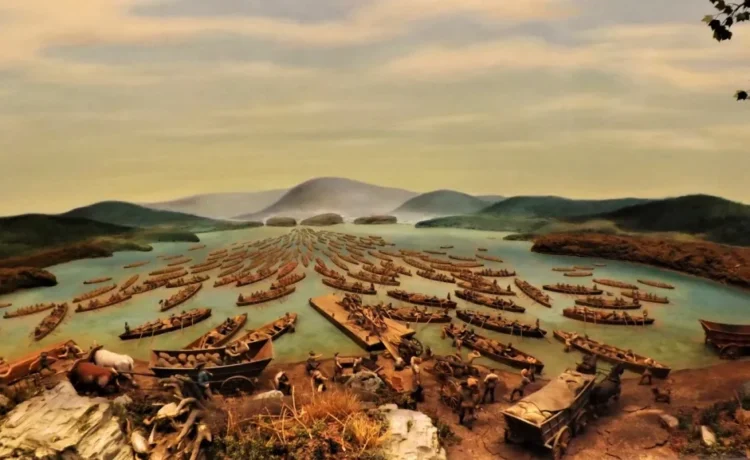 Illustrations, from above: detail of a 1950s Adirondack Museum diorama of Abercromby’s flotilla launching from Fort William Henry on Lake George in 1758, now located at the Lake George Battlefield Park Visitors Center; Lord Howe, Jeffery Amherst and John Burgoyne inscriptions on the Ticonderoga Memorial Stone in Artillery Park, 2008 (photo by Bill Coughlin); and historical marker along the La Chute River in Ticonderoga marking the death of Lord Howe.
