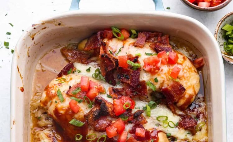 This mouthwatering Monterey chicken is slathered in tangy barbecue sauce, covered in melty cheese, and topped with crisp bacon and sweet tomatoes. The combination of all these flavors creates a satisfying dish your family will want on repeat!