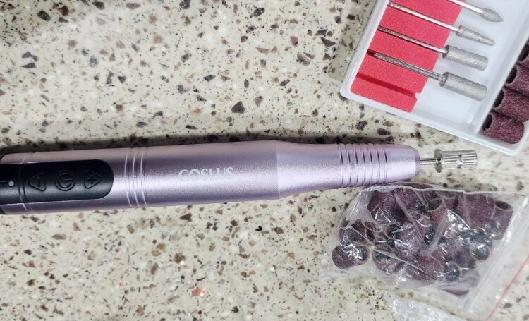 purple nail drill and accessories on counter