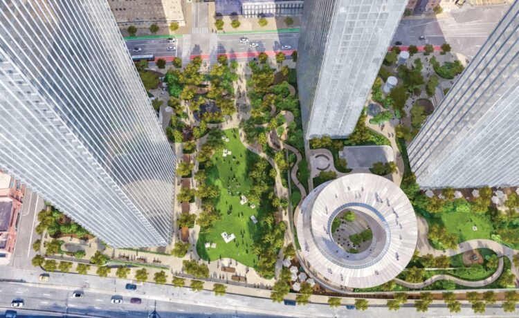 When arriving at the park, visitors will enter through a lush plaza framed by 350 trees from eight species and a curated selection of plants designed to promote biodiversity, enhance stormwater absorption, and provide seasonal interest year-round.