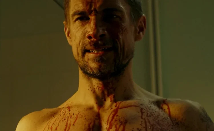 A close-up of a shirtless man with a bloodied and bruised face, his expression stern and intense.