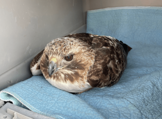 He then contacted a local wildlife rehabilitator who responded to the location, assessed the hawk, and determined its right wing was swollen and the bird appeared malnourished.