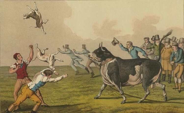 “I went with some friends to the bear-garden, where was cock-fighting, dog-fighting, bear and bull baiting, it being a famous day for all these butcherly sports, or rather barbarous cruelties. The bulls did exceedingly well, but the Irish wolf-dog exceeded, which was a tall greyhound, a stately creature indeed, who beat a cruel mastiff. One of the bulls tossed a dog full into a lady’s lap, as she sat in one of the boxes at a considerable height from the arena. Two poor dogs were killed, and so all ended with the ape on horseback, and I most heartily weary of the rude and dirty pastime, which I had not seen, I think, in twenty years before.”