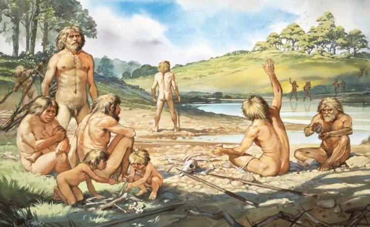 Homo heidelbergensis on the ancient banks of the river Thames in modern-day Swanscombe, UK